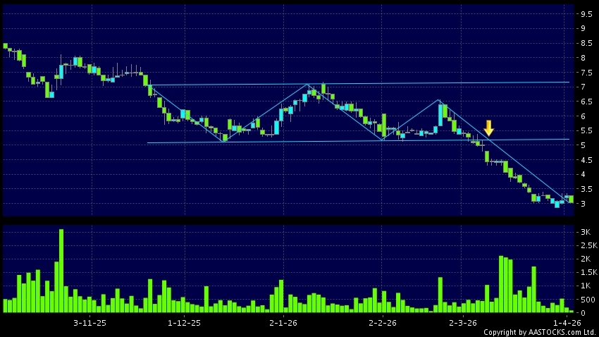 IMOTIONTECH(01274.HK)  -0.240 (-7.362%)   appears a downside range breakout. Last printed at 3.030; fell 7.055%; on volume of 86.00K shares and turnover of $265.37K